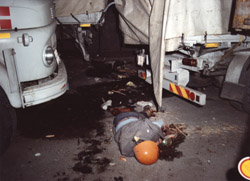 Auf dem Wege von Zenica nach Tuzla muß man durch die Stadt Maglaj. Kurz vor der Stadt Maglaj durch den Maglajtunnel. Die Militärpolizei stoppt unseren Wagen. Wir müssen zufuß weiter. Wenige Minuten vorher war eine 88 mm Granate eines serbischen Panzers russischer Bauart:T64 vor dem Tunnelende eingeschlagen. Der Serbische Panzer war circa zwei kilometer entfernt in den Bergen und beschoß einen dänischen Hilfskonvoi von UNHCR, der Grundnahrungsmittel, wie Mehl und Zucker nach Tuzla bringen wollten. Zwei dänische Soldaten waren sofort tot. Ebenso wie ein kroatischer Dolmetscher. Kurz nach dem Foto fiel eine weitere Granate unweit des Tunnels und ein kleiner Granatsplitter traf dem Blitz der Kamera des Kollegen Bellwinkel. Wir konnten den ganzen Tag kaum noch hören, so stark war die Druckwelle. |